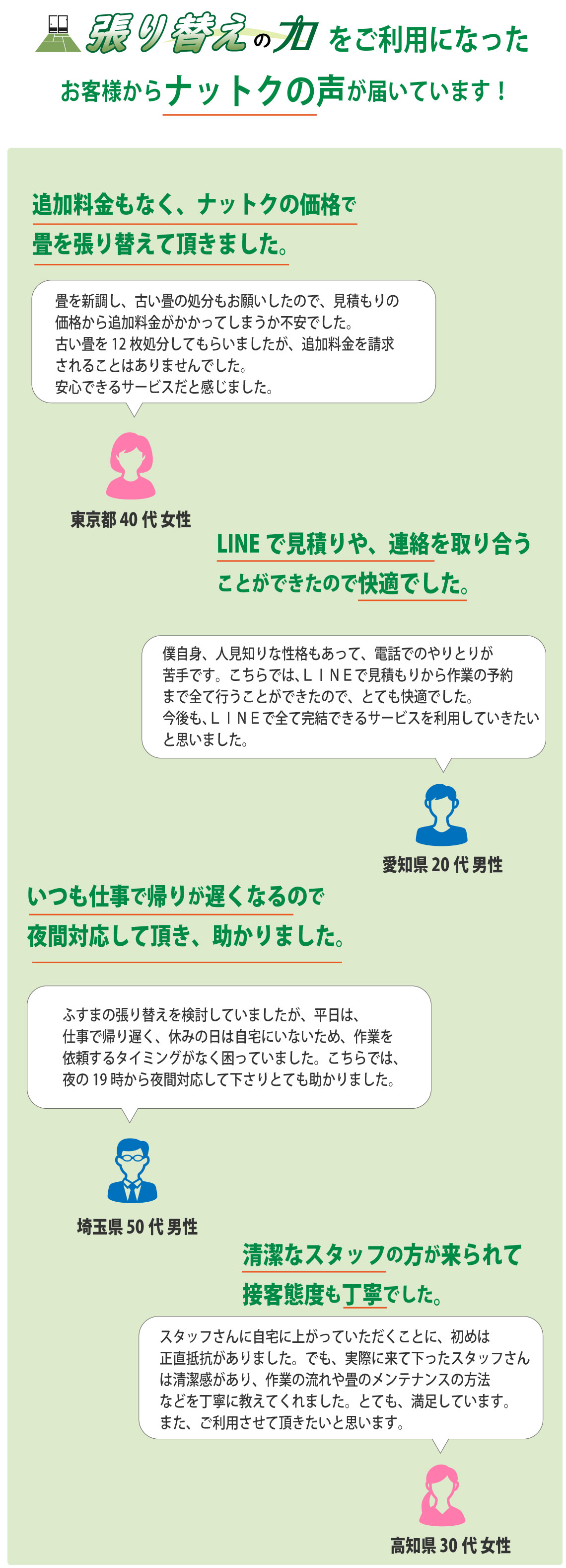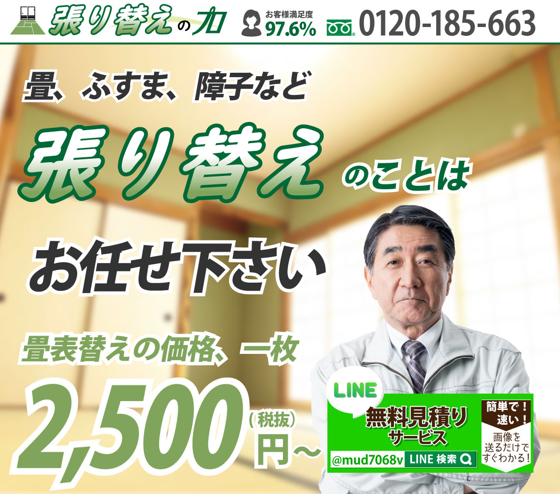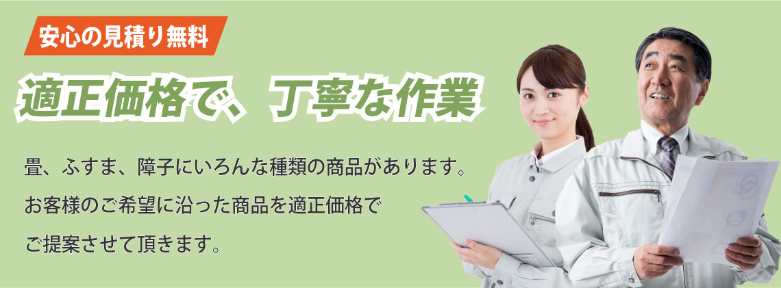 畳、襖、障子の張替えを考えた時、どういった業者に依頼すれば良いのでしょうか?どれくらいの料金がかかるのか、どういった対応を行うのかなど多くの心配がある方もみえるかと思います。そこで価格・対応・サービスなど業者を選ぶ際に知っておきたいポイントを押さえて、気持ちよく張替えを終わらせましょう。最初に気になるのは値段ではないでしょうか。出来うるものなら安価、低価格で依頼したいですよね。張替えの料金は、ある程度の相場は決まっていますが、一概に何円とはなかなか言えません。商品の品質や張替えの対応(畳であれば裏返し、表替え、新調など)で料金は変わってきます。そこで業者が商品や対応の説明をしっかり行い、最適な方法を提案してくれるかということを確認してみましょう。加えて、無料見積もりの利用をおすすめいたします。優良業者であれば、見積もりの詳細まで説明を行ってくれるので、追加料金の発生もありません。あわせて、業者の対応が親身であるかも見ておきましょう。こちらの相談や質問に対して、丁寧・的確・誠実に対応してもらえれば安心して張替えを検討できます。また、業者の技術・知識力も大切ですね。例えば、畳であれば『畳製作技能士』という資格もあるので問い合わせ時に作業員がそういった資格を持っているか確認しておきたいものです。他にもチェックしておきたいポイントがいくつかあります。商品の取り扱いが多い業者であれば、商品の価格や品質といった選択肢が増えて、商品選びがしやすくなります。また、小さなことですが、作業前の家具の移動、畳の拭き取りといったサービスを利用できると助かりますね。もし張替えでお悩みの際は、まずは気軽な問い合わせをおすすめいたします。安心できる業者であれば、小さな質問や相談からでも受け付けています。いきなりの問い合わせは不安という方は、業者によってはweb(LINE、メールなど)見積もり、相談も行っています。これらの知っておきたいポイントに気をつけつつ、満足のいく張替えにしたいですね。